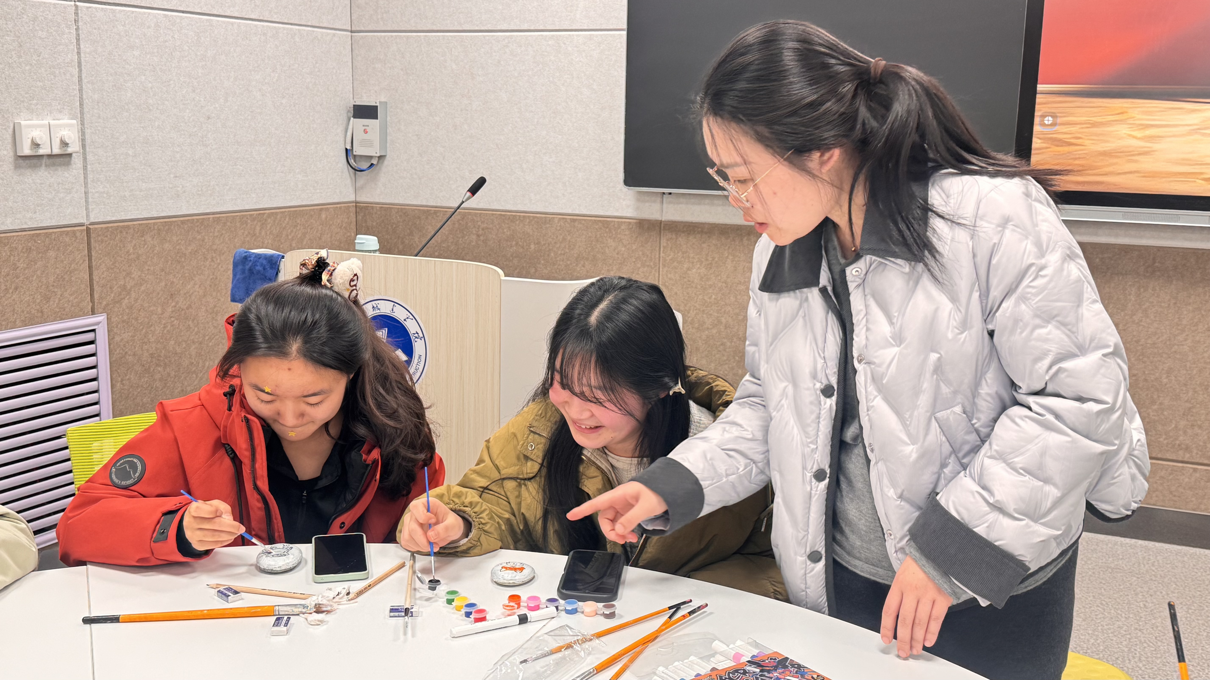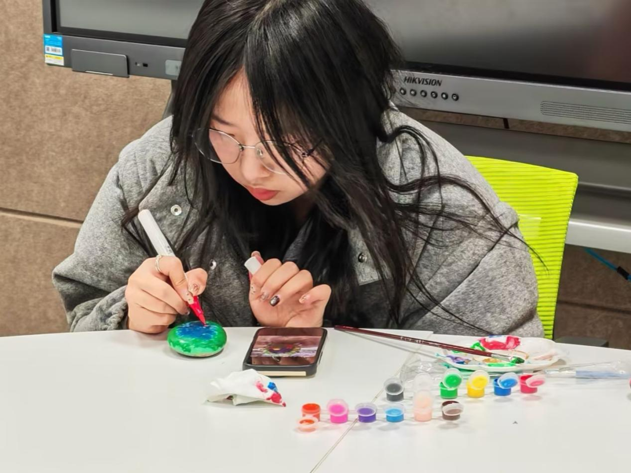 公司王璐璐老师以“非遗艺术与情绪表达”为核心开展专业指导,从石头画起源与发展脉络切入,讲解非遗艺术的传承与创新,重点引导同学们通过艺术创作外化内心情绪,掌握以绘画疏压的方法。大家紧扣“情绪表达”核心,将内心积压的情绪、对生活的感悟转化为笔下的色彩与图案,在方寸石块上勾勒心声、释放压力。整个活动现场,创意的火花与治愈的力量交织,让每一块石头都成为情绪的“避风港”。