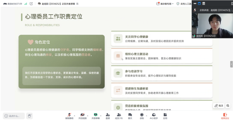 为进一步夯实公司心理健康教育工作根基,完善“校-院-班-寝”四级心理防护体系,切实发挥心理委员朋辈帮扶核心作用,掌握工作方法,提升工作成效,1月27日,公司以腾讯会议形式召开2025年度心理委员述职会议。公司党委副书记田永果、辅导员王璐璐及各班心理委员参加本次会议。